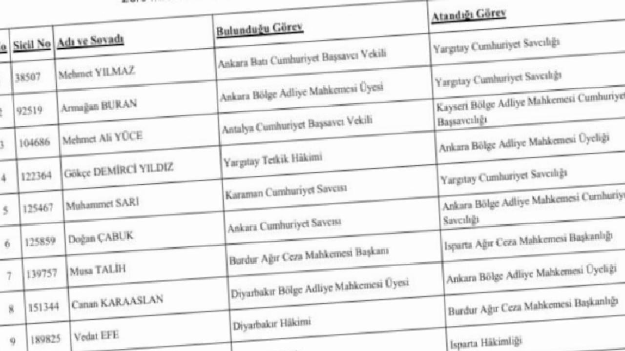 Diyarbakır Bölge Adliye Mahkemesi Üyesi Canan Karaaslan Ankara Bölge Adliye Mahkemesi Üyeliğine, Diyarbakır Hakimi Vedat Efe Burdur Ağır Ceza Mahkemesi Başkanlığına, Burdur Hakimi Esra Nur Talih Isparta Hakimliğine, Yalvaç Cumhuriyet Savcısı Burak Özer Çubuk Cumhuriyet Savcılığına, Bodrum Cumhuriyet Savcısı Oğuz Saylam Elmalı Cumhuriyet Başsavcılığına, Nazilli Hakimi Aslıhan Erhan Ankara Hakimliğine ve Ankara Batı Cumhuriyet Savcısı Şerife Evleksiz Kızılcahamam Cumhuriyet Başsavcılığına getirildi.