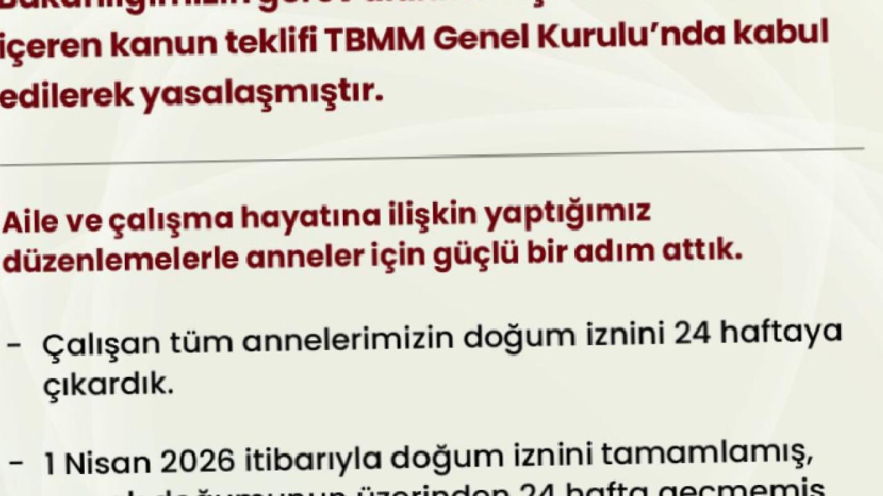 Yeni yasayla birlikte çalışan annelerin doğum izni süresi 24 haftaya çıkarıldı. Ayrıca 1 Nisan 2026 itibarıyla doğum iznini tamamlamış ancak doğumunun üzerinden 24 hafta geçmemiş annelere 8 haftalık ek izin hakkı tanındı.
