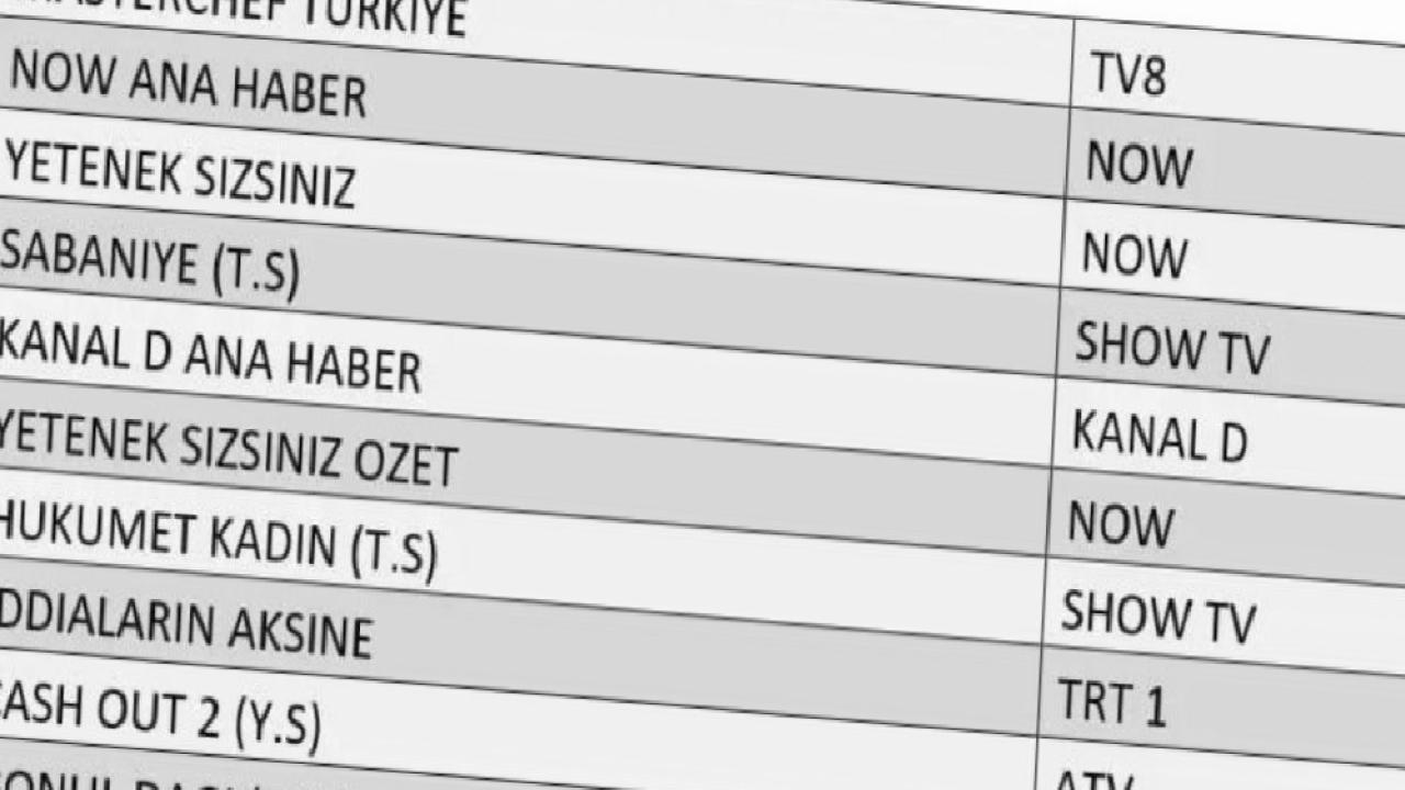 Total kategorisinde “MasterChef Türkiye”, zirvede yerini alırken, ikinci sırada “Now Ana Haber”, üçüncü sırada ise “Cash Out 2 (Yabancı Sinema)” kendine yer buldu.