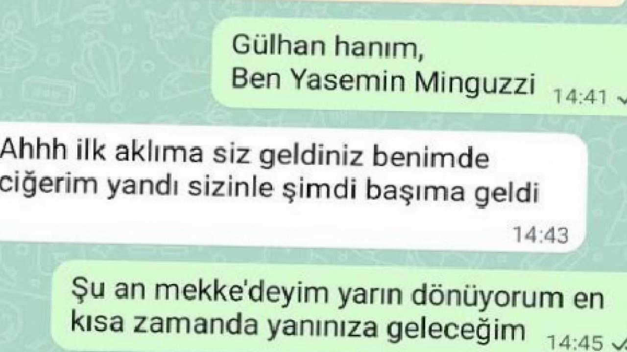 Umre ibadetini yerine getirmek üzere kutsal topraklarda bulunan Yasemin Minguzzi, Atlas Çağlayan'ın annesi Gülhan Çağlayan'a mesaj atarak yaşadığı acıyı paylaştı. Minguzzi, mesajında "Ben Yasemin Minguzzi" diyerek kendisini tanıttı, yaşanan olay sonrası içinin yandığını ifade etti.