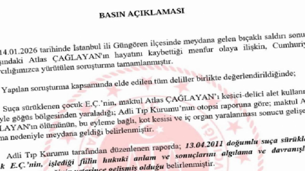 İSTANBUL () - Bakırköy Cumhuriyet Başsavcılığı, 14 Ocak 2026’da Güngören ilçesinde meydana gelen ve 16 yaşındaki Atlas Çağlayan’ın hayatını kaybettiği bıçaklı saldırıya ilişkin soruşturmayı tamamladı.