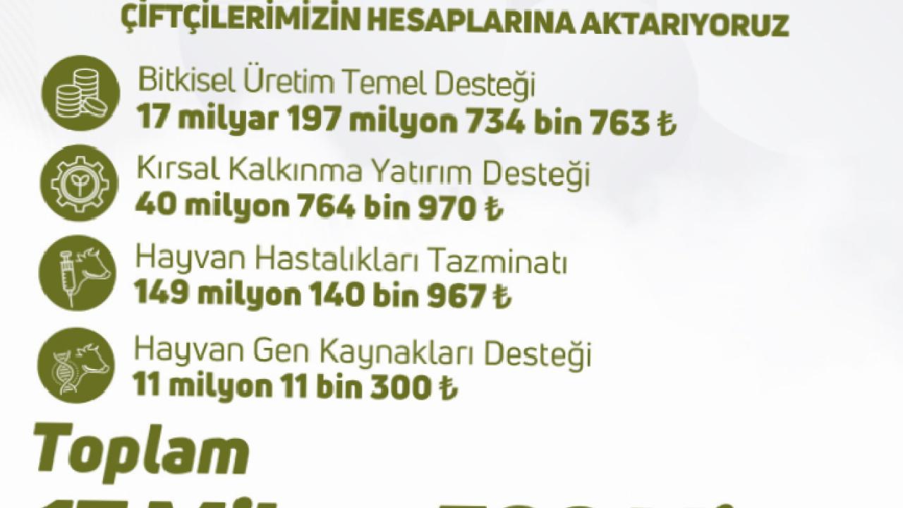 Bakan Yumaklı, yaptığı paylaşımda çiftçilere toplam 17 milyar 398 milyon TL tutarında tarımsal destek ödemesinin hesaplara aktarıldığını açıkladı.
