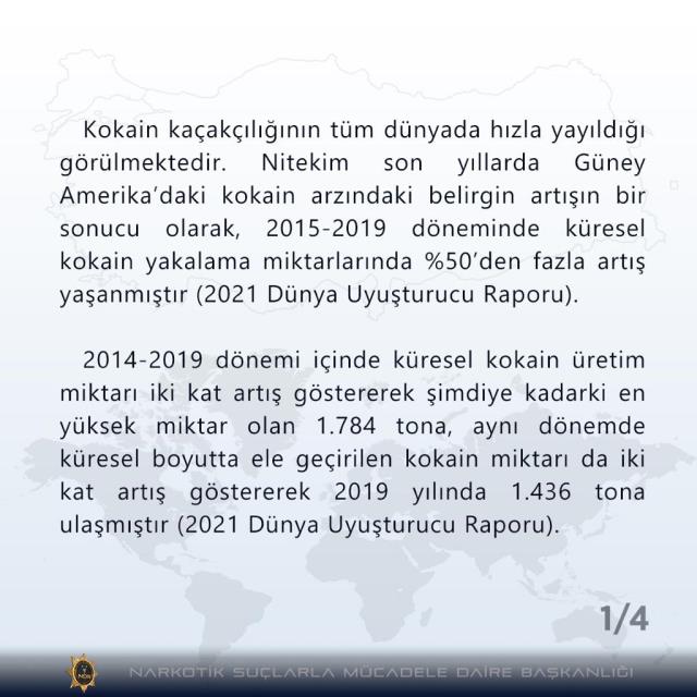 Narkotik Daire Başkanlığı da Birleşmiş Milletler tarafından hazırlanan raporu paylaştı. Narkotik Daire Başkanlığı'nın raporunda, "Narkotik Daire Başkanlığı'nın raporunda, "Mevcut veriler incelendiğinde Türkiye'nin kokain kaçakçılığında önde gelen merkez bir üs olarak nitelendirilmesi yerine küresel kaçakçılık rotalarının genişlemesinin bir sonucu olarak alternatif bir güzergah nitelendirilmesi doğru bir yaklaşım olacaktır" denildi.