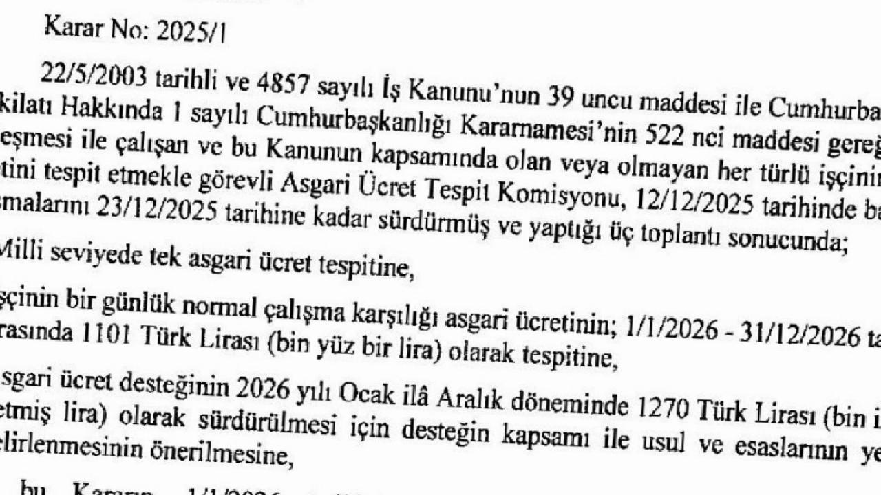 Yeni asgari ücret 1 Ocak 2026 tarihinden itibaren geçerli olacak.