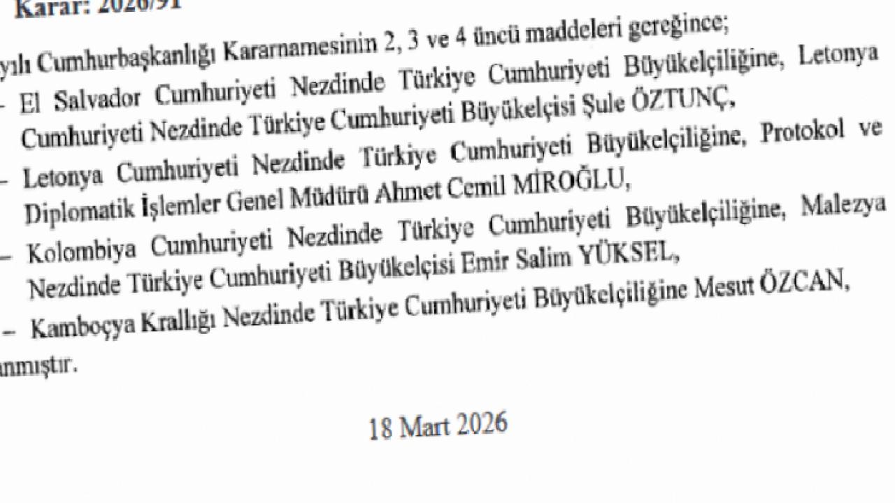 ANKARA () - Cumhurbaşkanı Recep Tayyip Erdoğan imzasıyla Resmi Gazete’de yayımlanan kararlar kapsamında, Türkiye’nin çeşitli ülkelerdeki büyükelçiliklerine yeni atamalar gerçekleştirildi.