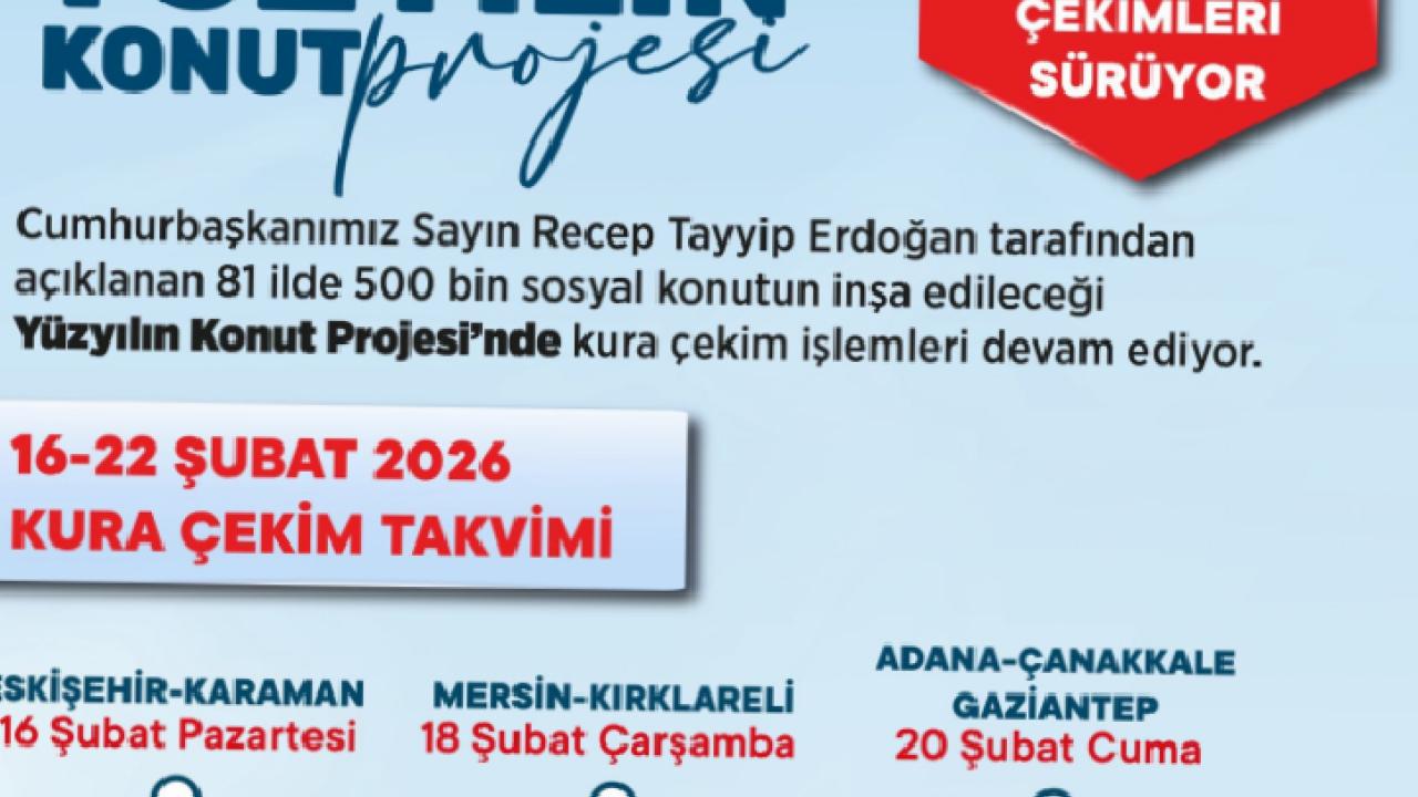 16-22 Şubat haftası takvimine göre; 16 Şubat Pazartesi Eskişehir’de 6 bin 55, Karaman’da 1.550, 17 Şubat Salı Konya’da 15 bin 200, Sakarya’da 6 bin 633, 18 Şubat Çarşamba Mersin’de 8 bin 190, Kırklareli’nde 2 bin 255, 19 Şubat Perşembe Diyarbakır’da 12 bin 165, 20 Şubat Cuma Adana’da 12 bin 400, Çanakkale’de 3 bin 276, Gaziantep’te 13 bin 890, 21 Şubat Cumartesi Bursa’da 17 bin 225 konutun daha hak sahipleri belirlenecek. Böylece 16-22 Şubat 2026 haftasında 11 ilde toplam 98 bin 839 konutun daha kurası çekilecek. 22 Şubat’ta kurası çekilen il sayısı 69’a hak sahibi belirlenen konut sayısı ise 312 bin 290’a yükselecek.