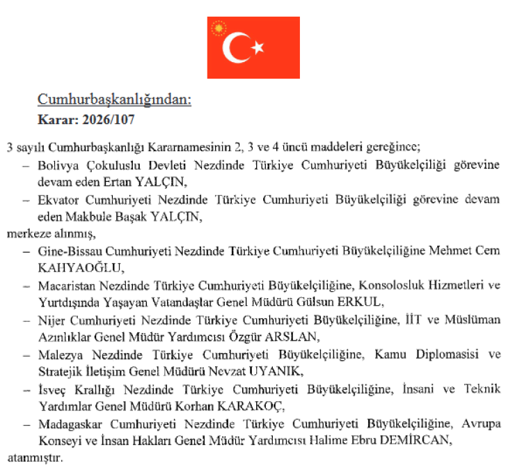 Kararla birlikte Türkiye’nin 7 ülkedeki büyükelçilik görevlerine yeni isimler getirildi. Buna göre, Gine Bissau Büyükelçiliğine Mehmet Cem Kahyaoğlu, Macaristan Büyükelçiliğine Dışişleri Bakanlığı Konsolosluk Hizmetleri ve Yurtdışında Yaşayan Vatandaşlar Genel Müdürü Gülsun Erkul atandı.