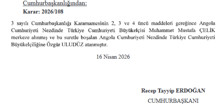 ANKARA () - Cumhurbaşkanı Recep Tayyip Erdoğan’ın imzasıyla yapılan büyükelçi atamalarına ilişkin kararlar Resmî Gazete’de yayımlandı.