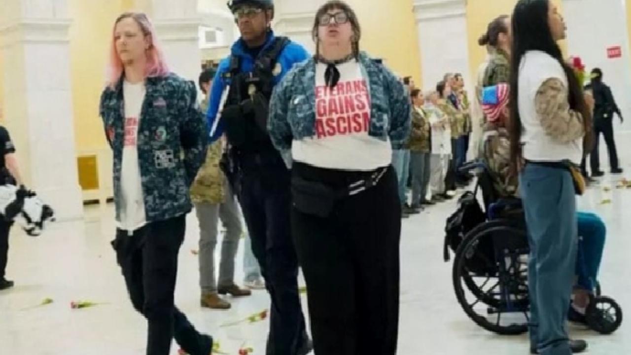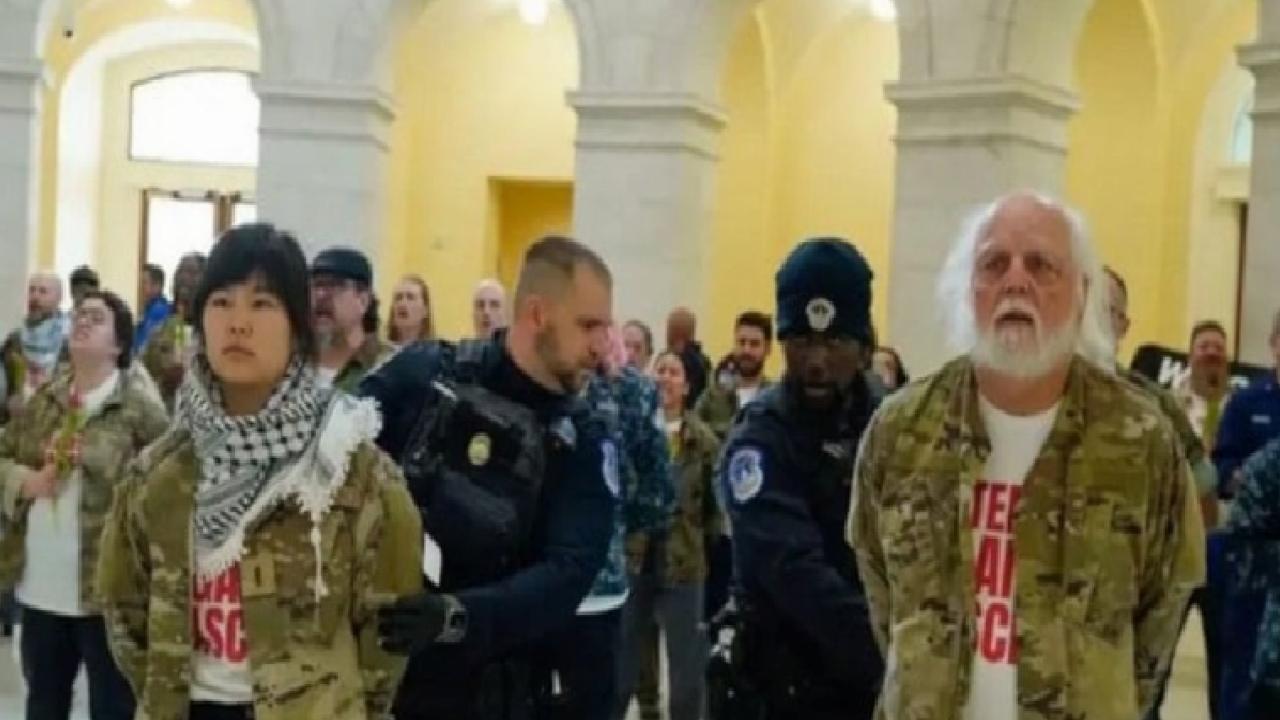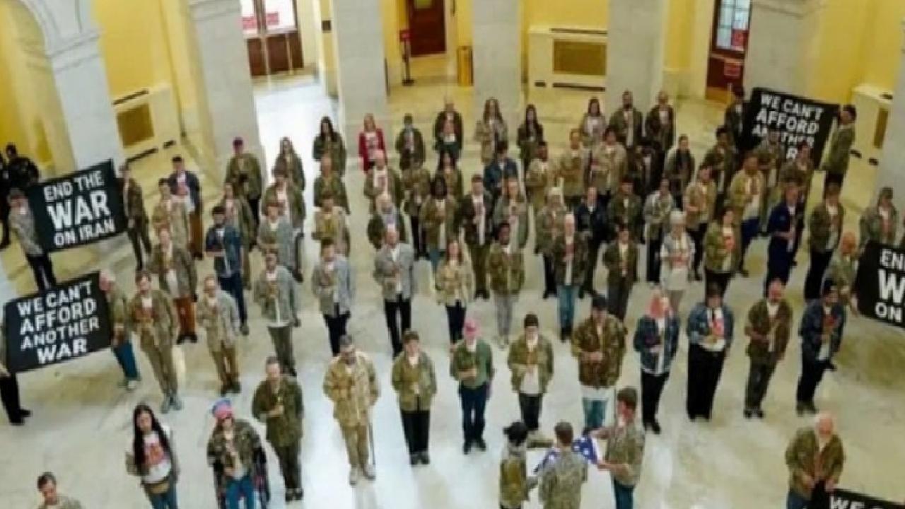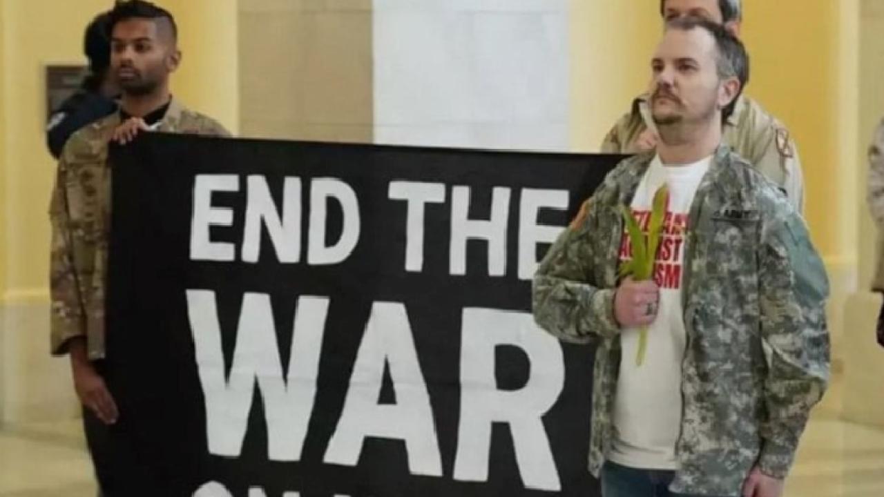 Göstericiler, Kongre binasının “Cannon Rotunda” olarak bilinen ana salonunda bir araya gelerek İran’a yönelik askeri adımlara karşı tepkilerini dile getirdi. ABD askeri üniforması giyen protestocular, taşıdıkları dövizlerle mesaj verdi.