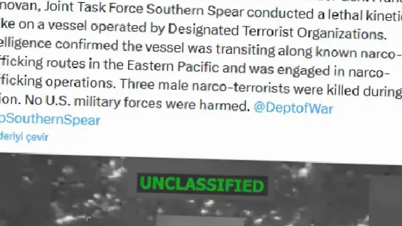 ABD ordusunun Doğu Pasifik Okyanusu'nda uyuşturucu kaçakçılığı yaptığı iddiasıyla bir tekneye düzenlediği saldırıda 3 kişi öldü. ABD Güney Komutanlığı (SOUTHCOM), teknenin bilinen "narko-kaçak güzergahında" seyrettiğini ve uyuşturucu operasyonuna karıştığını belirterek operasyonun "ölümcül kinetik saldırı" şeklinde icra edildiğini açıkladı.