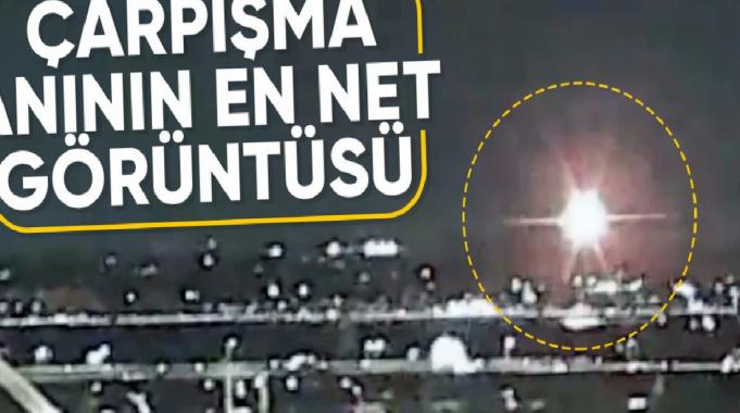 Havada çarpışma sonucu büyük bir ışığın çıktığı, patlama olduğu ardından da uçağın hızla düştüğü görülüyor.