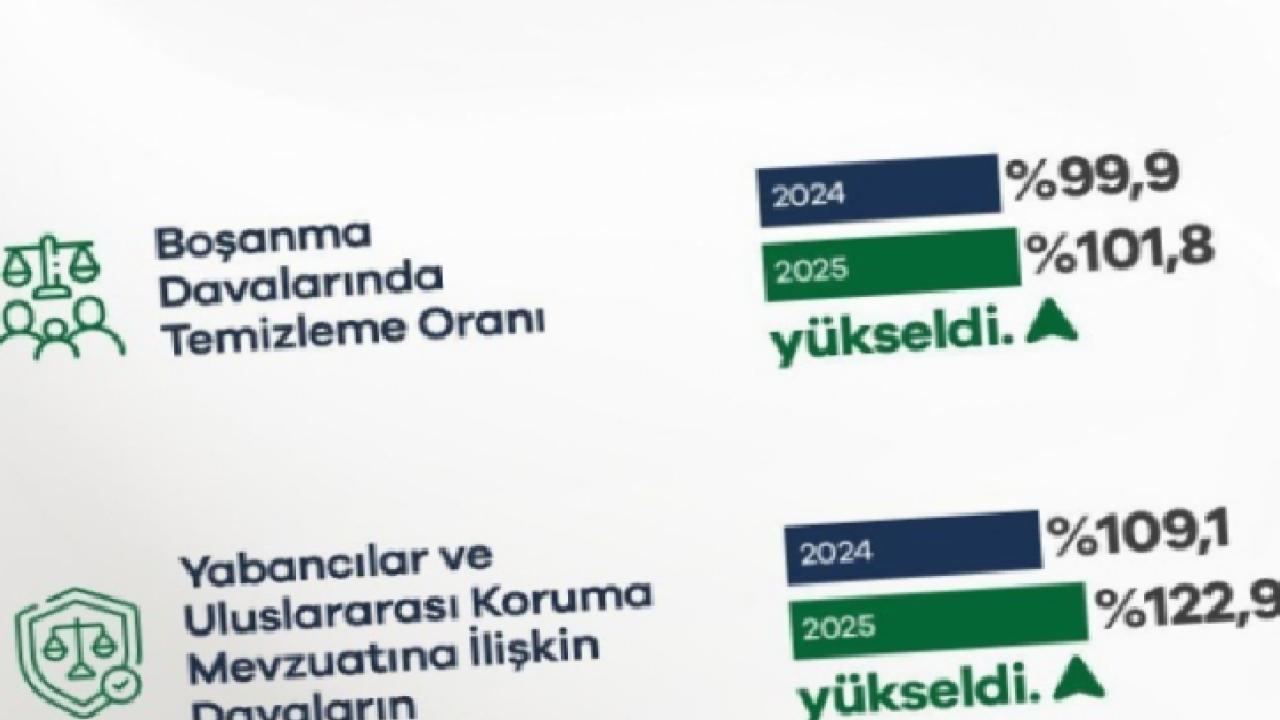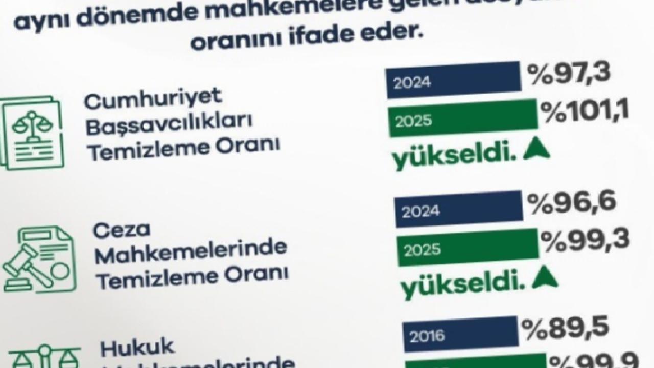 2025 yılında hukuk mahkemelerinde temizleme oranı yüzde 99,9’a, ceza mahkemelerinde yüzde 99,3’e yükseldi. Kadastro mahkemelerinde ise yüzde 151,3’e ulaşan oran, açılan dosyalardan daha fazlasının karara bağlandığını gösterdi.