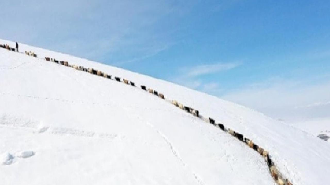Karla kaplı dar patikalardan ilerleyen sürüler, dağların arasındaki geçitlerde tek sıra halinde yürümek zorunda kalıyor.