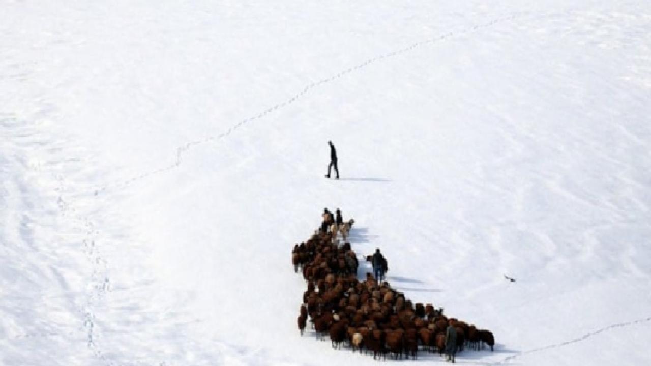 Karın arasında ilerleyen yüzlerce hayvandan oluşan sürülerin zorlu yolculuğu ise dron ile havadan görüntülendi.