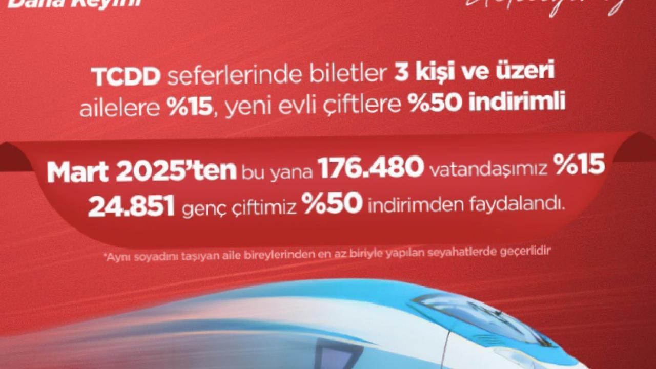 Uygulamaya göre, 3 kişi ve üzeri aileler biletlerde yüzde 15, yeni evli çiftler ise yüzde 50 indirimle seyahat edebiliyor. Mart ayından bu yana 176 bin 480 vatandaş yüzde 15 indirim, 24 bin 851 genç çift yüzde 50 indirim aldı; toplamda 201 bin 331 kişi yararlandı.