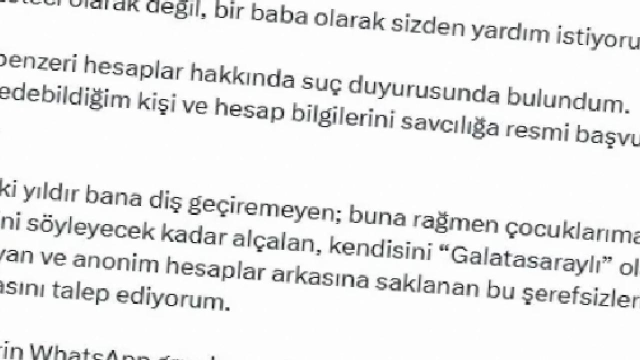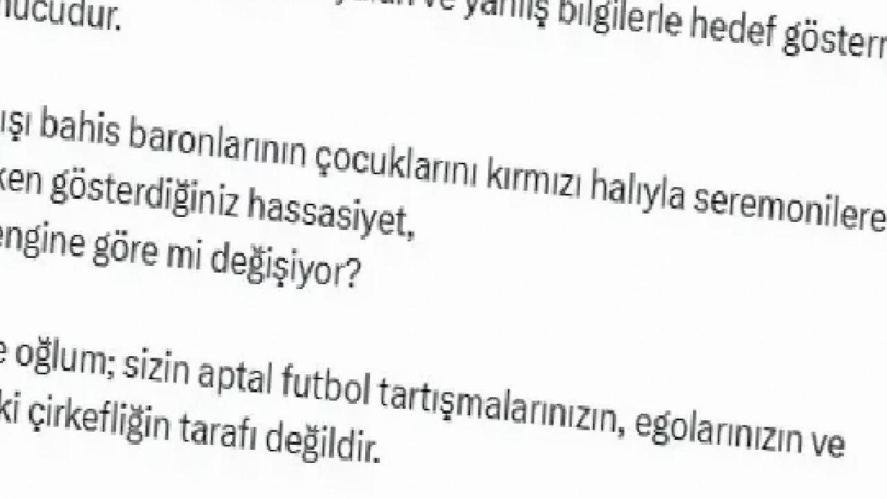 Yaşananlar, bizzat sizin beni yalan ve yanlış bilgilerle hedef göstermenizin bir sonucudur. Yasa dışı bahis baronlarının çocuklarını kırmızı halıyla seremonilere çıkarırken gösterdiğiniz hassasiyet, konu rengine göre mi değişiyor? Kızım ve oğlum; sizin aptal futbol tartışmalarınızın, egolarınızın ve içinizdeki çirkefliğin tarafı değildir. Yetiyorsa gücünüz bana yetsin. Çocuklarımdan uzak durun."