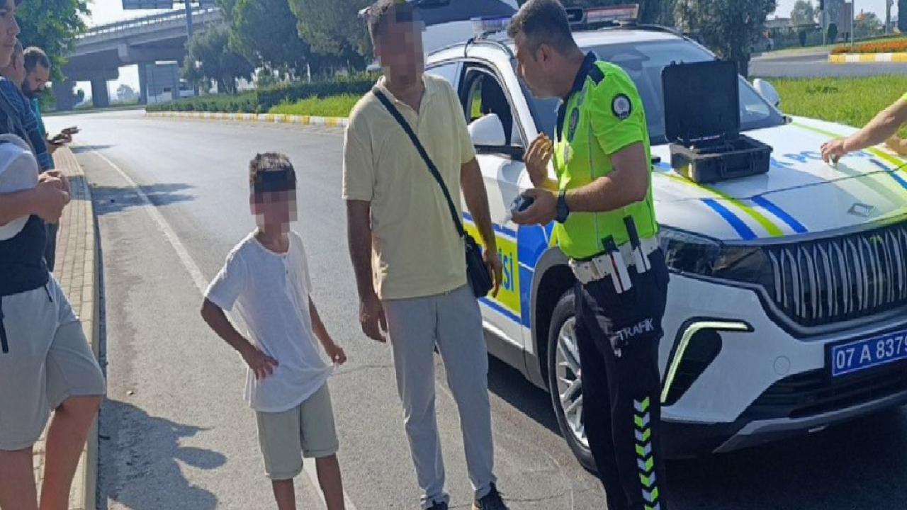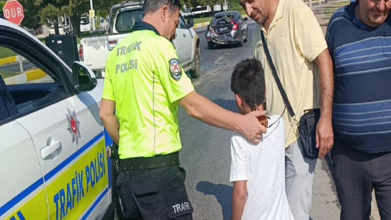 Üzüntüsünü hareketleriyle belli eden küçük çocuk zaman zaman gözyaşlarına hakim olamazken, onu teselli etmek babasına ve trafik polislerine düştü.