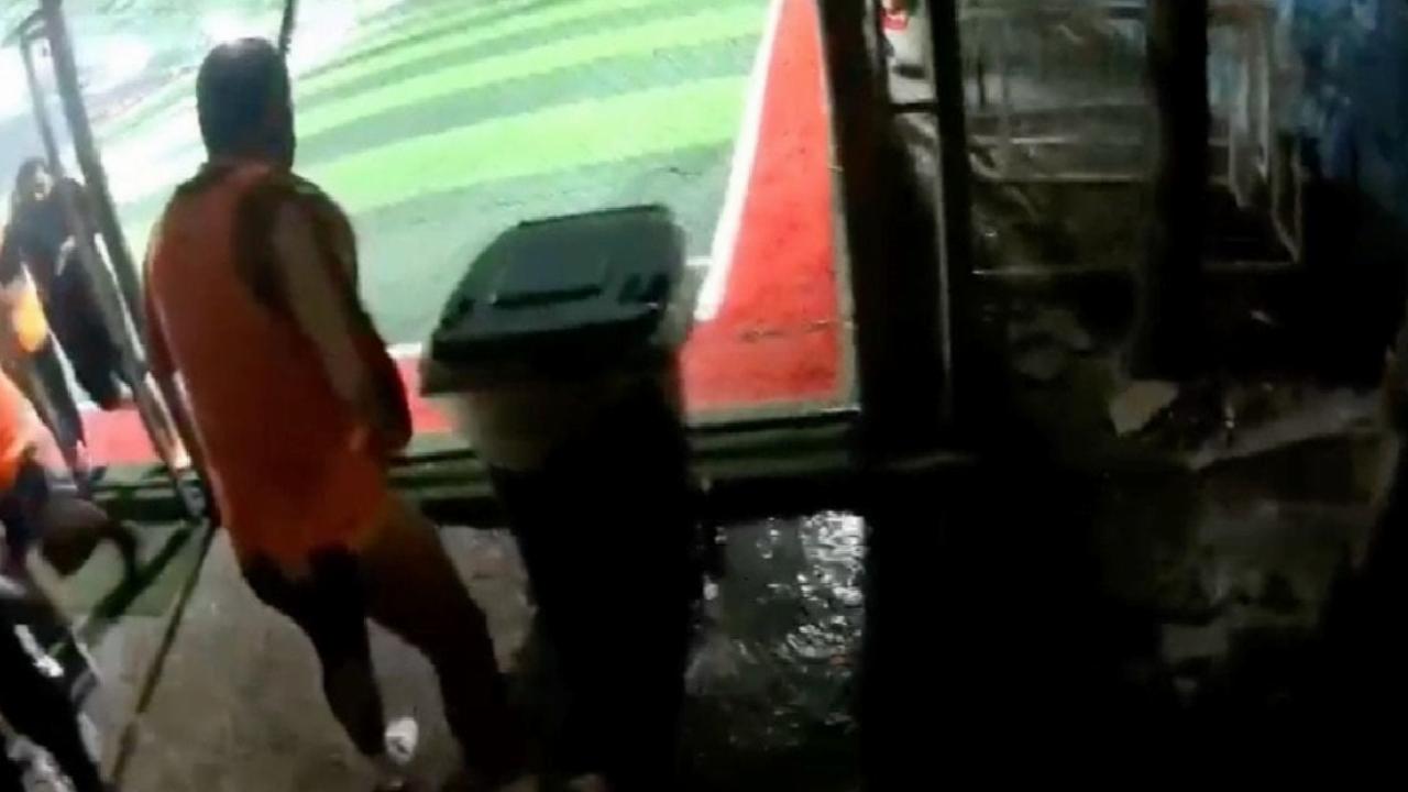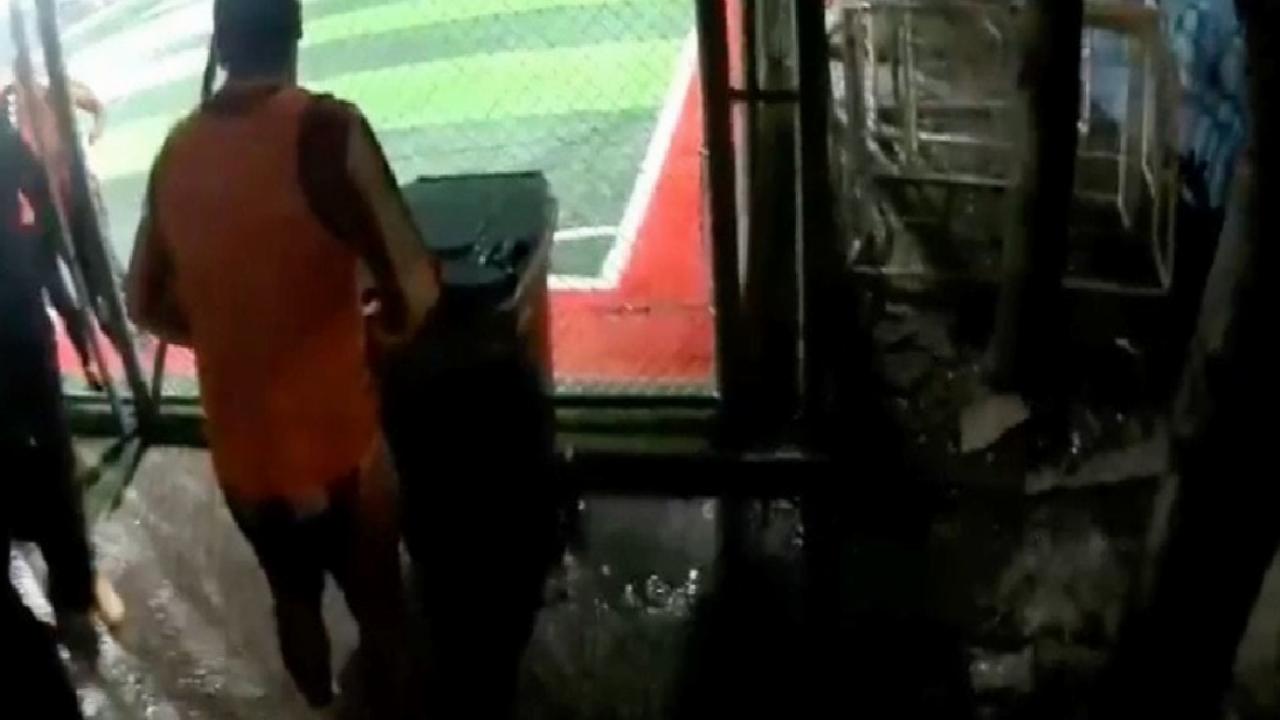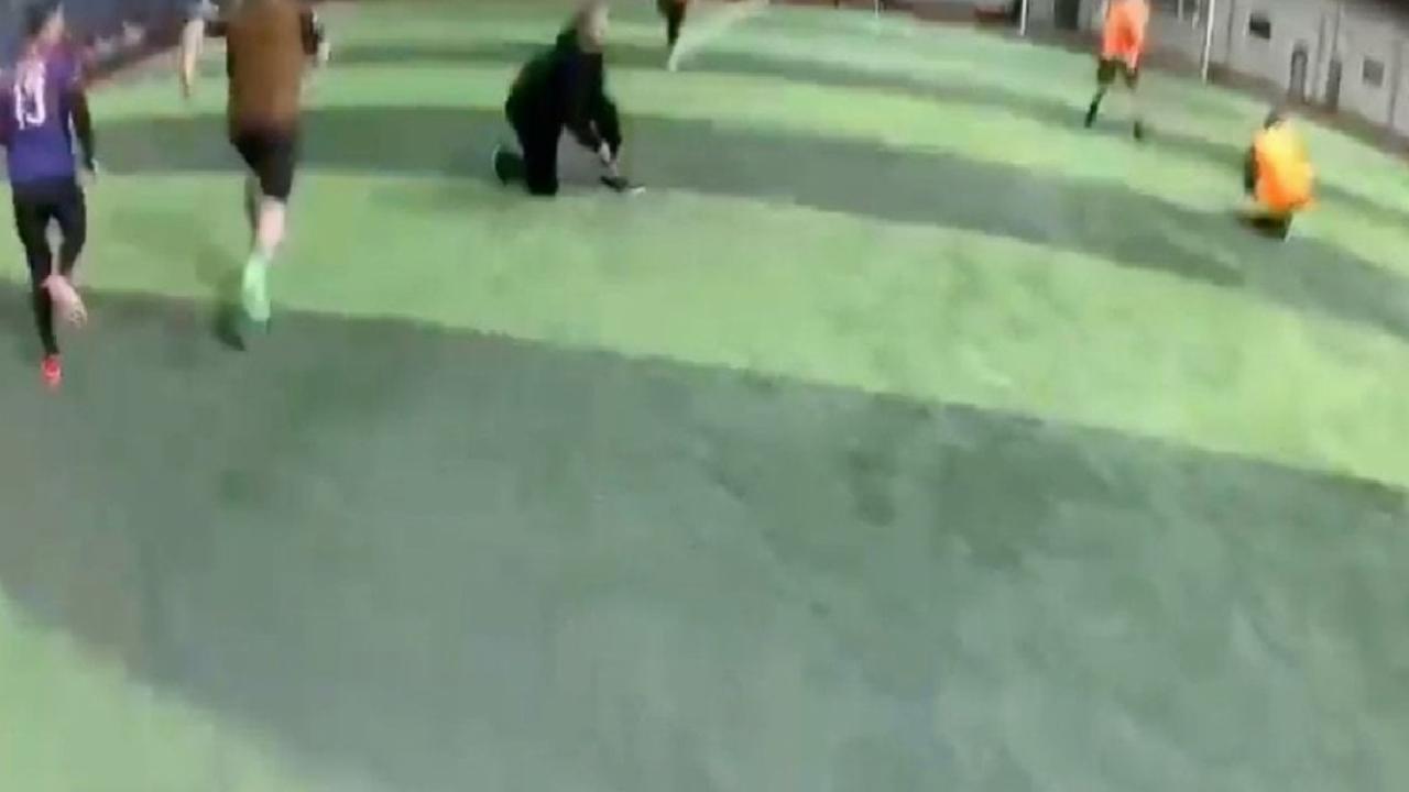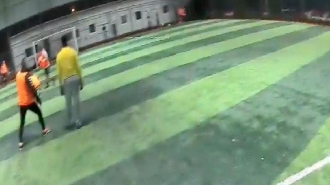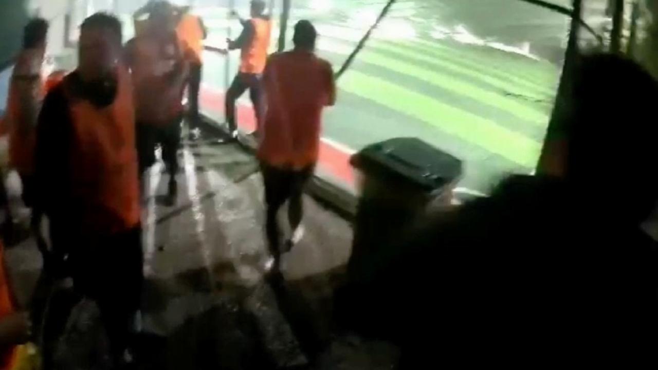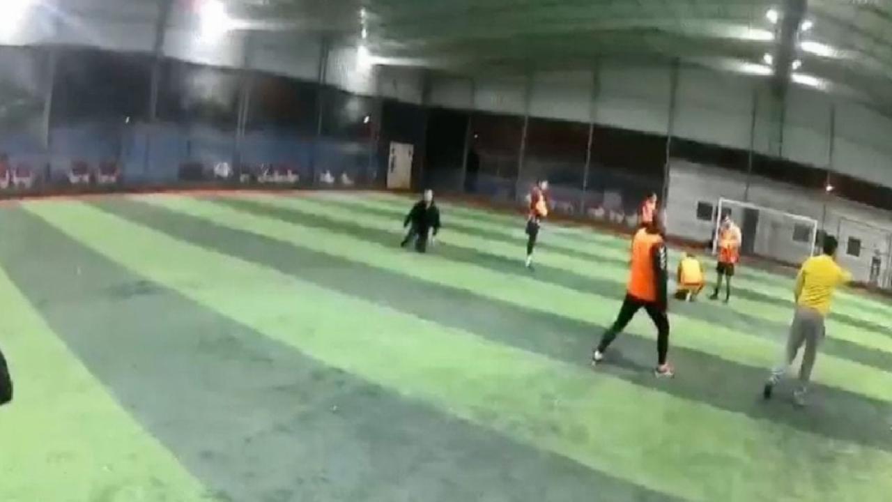 Saha hakkında konuşan futbolcular biranda gelen gürültüyle sahadan koşarak kaçarken, sahayı terk ettikleri anda çatıda çökme yaşandı. O anlar oyunculardan birinin aksiyon kamerasına saniye saniye yansıdı.