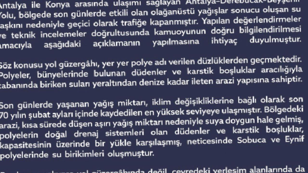 ANKARA () - Karayolları Genel Müdürlüğü, Antalya ile Konya arasında ulaşımı sağlayan Antalya-Derebucak-Beyşehir Yolu’nda son günlerde etkili olan aşırı yağışlar nedeniyle taşkın meydana geldiğini ve güzergâhın geçici olarak trafiğe kapatıldığını duyurdu.
