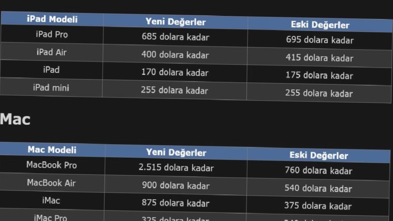 Teknoloji devi Apple, Amerika Birleşik Devletleri'nde geçerli olmak üzere iPhone, iPad, Mac ve Apple Watch modellerini kapsayan takas değerlerinde kapsamlı bir güncellemeye gitti.