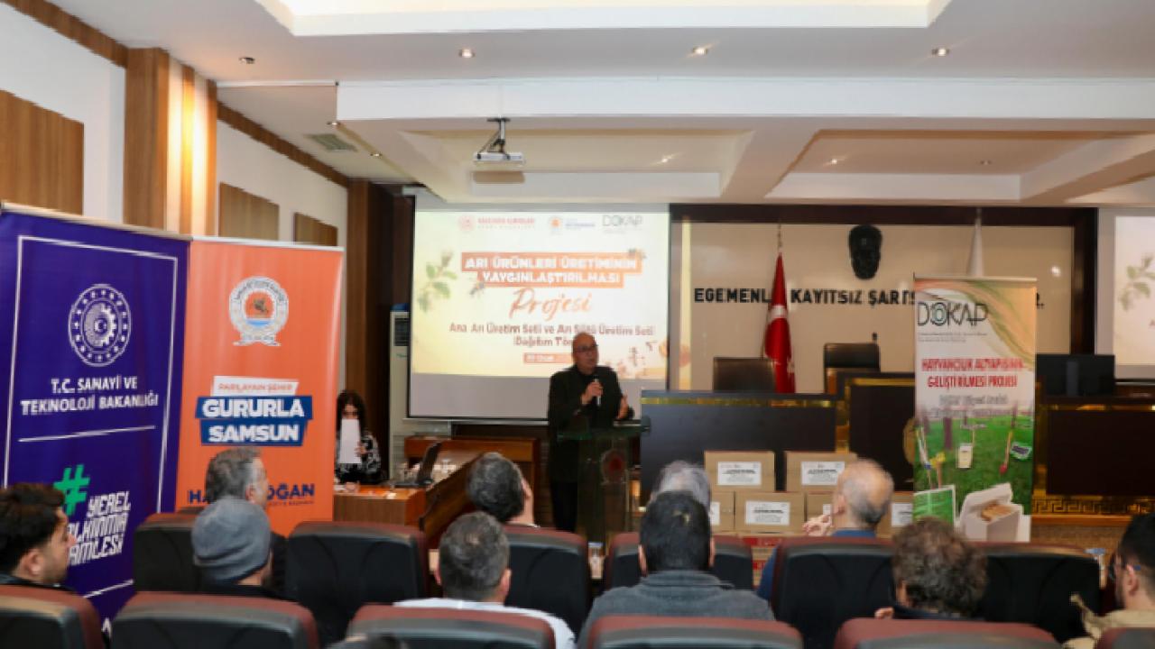 SAMSUN () - Samsun Büyükşehir Belediyesi ile Doğu Karadeniz Projesi Bölge Kalkınma İdaresi (DOKAP) iş birliğinde gerçekleştirilen “Samsun İlinde Arı Ürünleri Üretiminin Yaygınlaştırılması Projesi” kapsamında, üreticilere Ana Arı Üretim Seti ve Arı Sütü Üretim Seti teslim edildi. Samsun Büyükşehir Belediyesi tarafından düzenlenen törene; DOKAP Başkanı Hakan Gültekin, İl Tarım ve Orman Müdürü Kemal Yılmaz, Büyükşehir Belediyesi Genel Sekreter Yardımcısı Necmi Çamaş, Kırsal Hizmetler Daire Başkanı Mehmet Yıldız, Samsun İli Arı Yetiştiricileri Birliği Başkanı Rasim Kaplan ve arı yetiştiricileri katıldı.