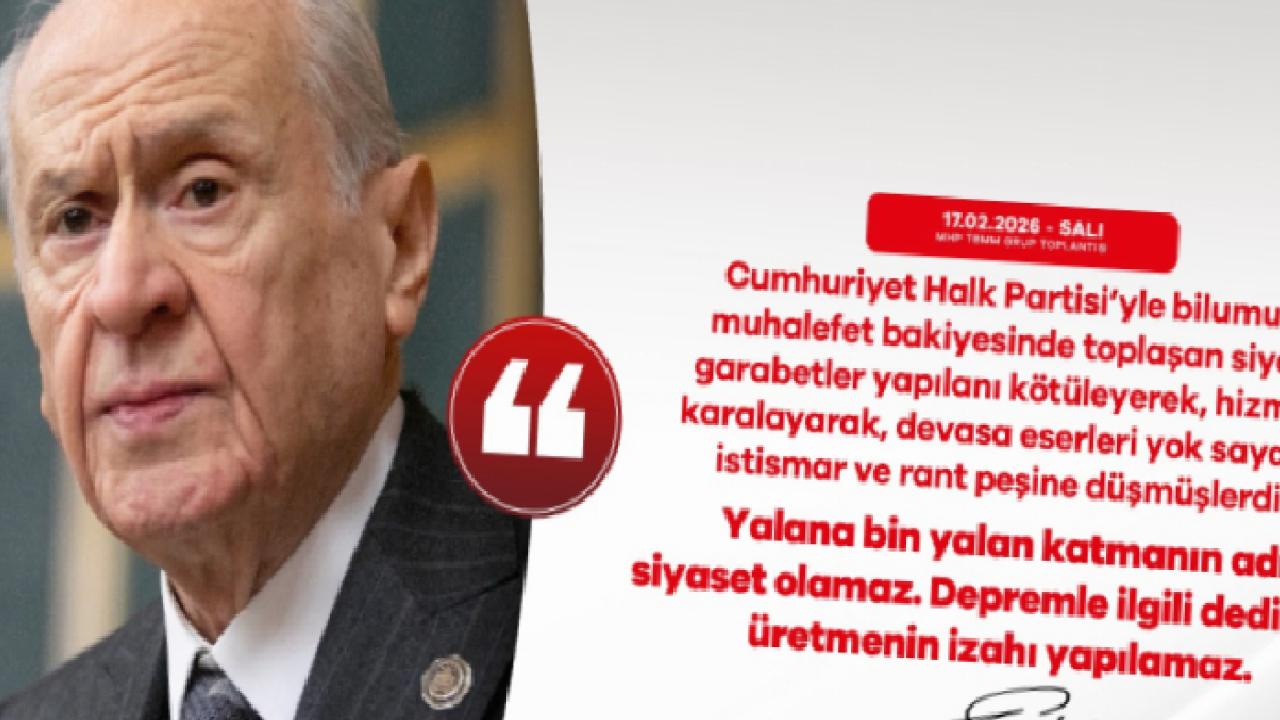 Depremle ilgili dedikodu üretmenin izahının, "Yalana bin yalan katmanın adının siyaset" olamayacağını belirten Bahçeli, "Doğruyla yanlışı tefrik edemeyen bir siyasetçinin vicdanından bahsedilemez. İyiyle kötüyü fark edemeyen bir siyasetçinin erdemli olmasını beklemek ise boşa kürek çekmekle eşdeğerdir. CHP yönetimi, doğal afetten siyasi afet çıkarmak için elinden geleni ardına koymamıştır." dedi.