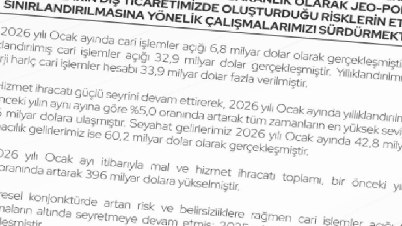 ANKARA () - Ticaret Bakanı Ömer Bolat, 2026 yılı Ocak ayı cari işlemler hesabına ilişkin verileri paylaştı. Buna göre, Ocak ayında cari işlemler açığı 6,8 milyar dolar olarak gerçekleşirken, yıllıklandırılmış cari işlemler açığı 32,9 milyar dolar seviyesinde ölçüldü. Altın ve enerji hariç yıllıklandırılmış cari işlemler hesabı ise 33,9 milyar dolar fazla verdi.