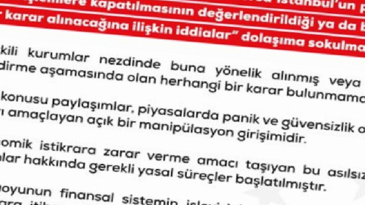 Söz konusu paylaşımların piyasalarda panik ve güvensizlik oluşturmayı amaçlayan açık bir manipülasyon girişimi olduğu ifade edilirken, ekonomik istikrara zarar verme amacı taşıyan asılsız içeriklerle ilgili gerekli yasal süreçlerin başlatıldığı kaydedildi. Kamuoyunun yalnızca resmi kurumların açıklamalarını dikkate alması istendi.