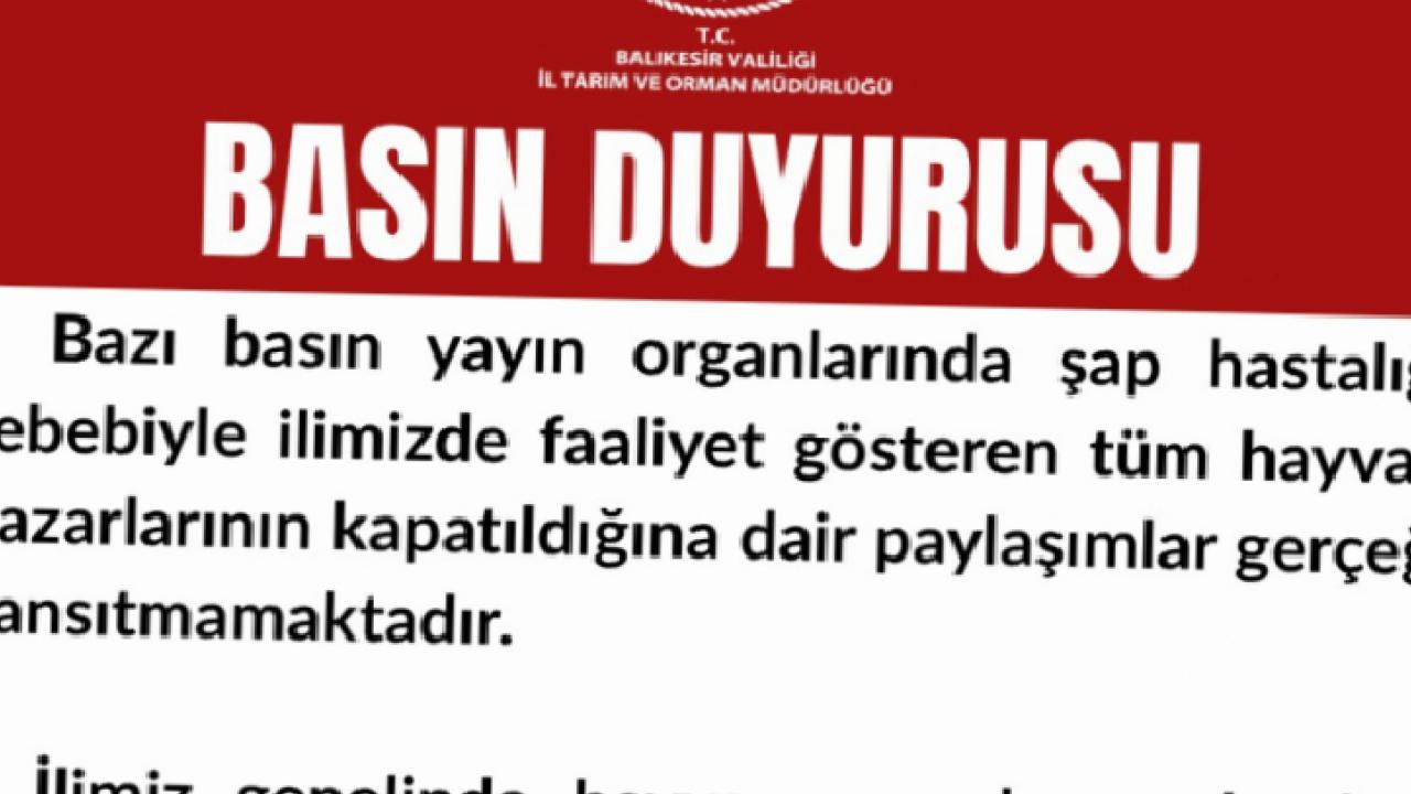 Açıklamada, bazı basın organları ve sosyal medya platformlarında “şap hastalığı nedeniyle Balıkesir genelindeki tüm hayvan pazarlarının kapatıldığı” yönünde paylaşımlar yapıldığı, ancak bu iddiaların gerçeği yansıtmadığı vurgulandı.
