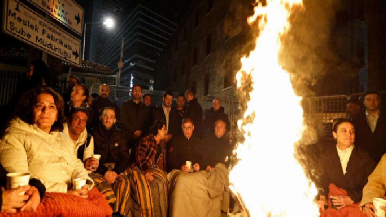 İZMİR () - Mülkiyeti İzmir Büyükşehir Belediyesi’ne ait olan Meslek Fabrikası binasına Vakıflar Bölge Müdürlüğü tarafından el koyulmasının ardından İzmir Büyükşehir Belediye Başkanı Cemil Tugay, dün bina önünde başlattığı nöbetini sürdürüyor.