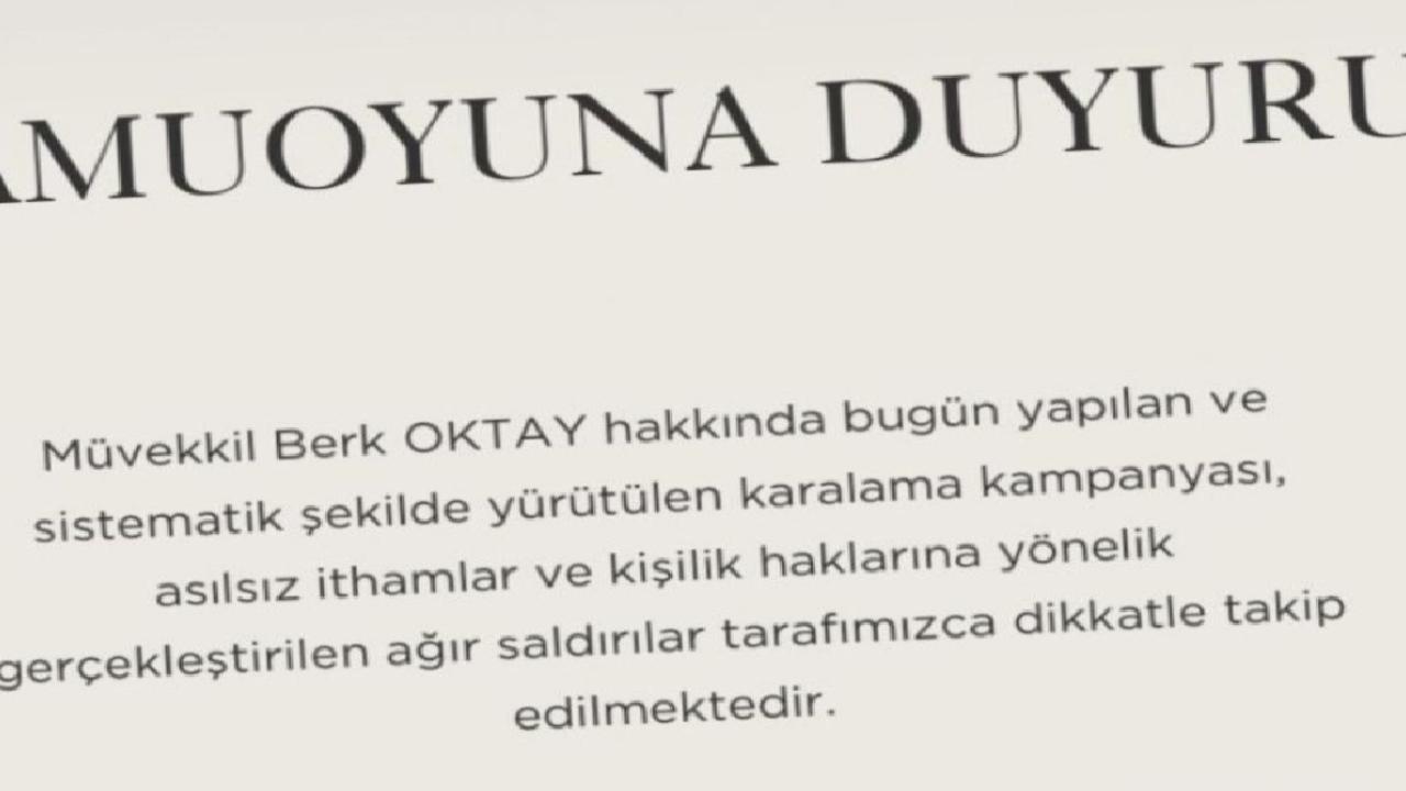 "Müvekkilimiz Berk Oktay hakkında bugün sistematik bir şekilde yürütülen karalama kampanyası, asılsız ithamlar ve kişilik haklarına yönelik ağır saldırılar tarafımızca dikkatle takip edilmektedir. Kamuoyunu yanıltmaya yönelik olarak ortaya atılan bu iddia ve paylaşımların hiçbir somut temele dayanmadığını ve gerçeği yansıtmadığını önemle belirtmek isteriz.