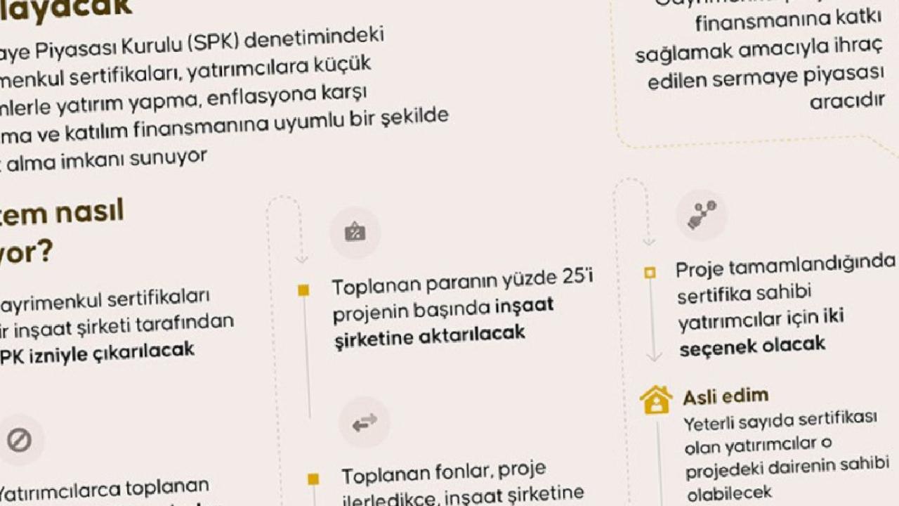 - Gayrimenkul projelerine küçük paylarla ortak olmanızı sağlayan Sermaye Piyasası Kurulu (SPK) denetimindeki bir yatırım aracıdır. Sertifikalar, Borsa İstanbul'da işlem görür, hisse senedi gibi alınıp satılabilir.