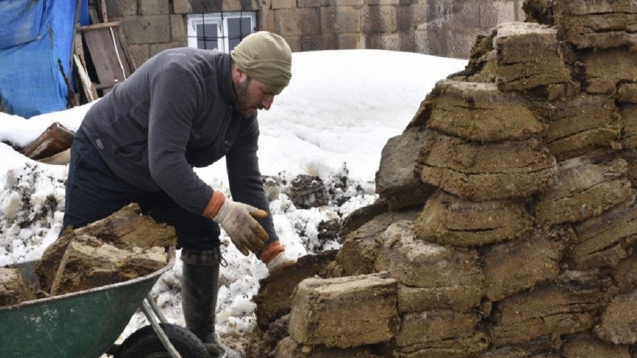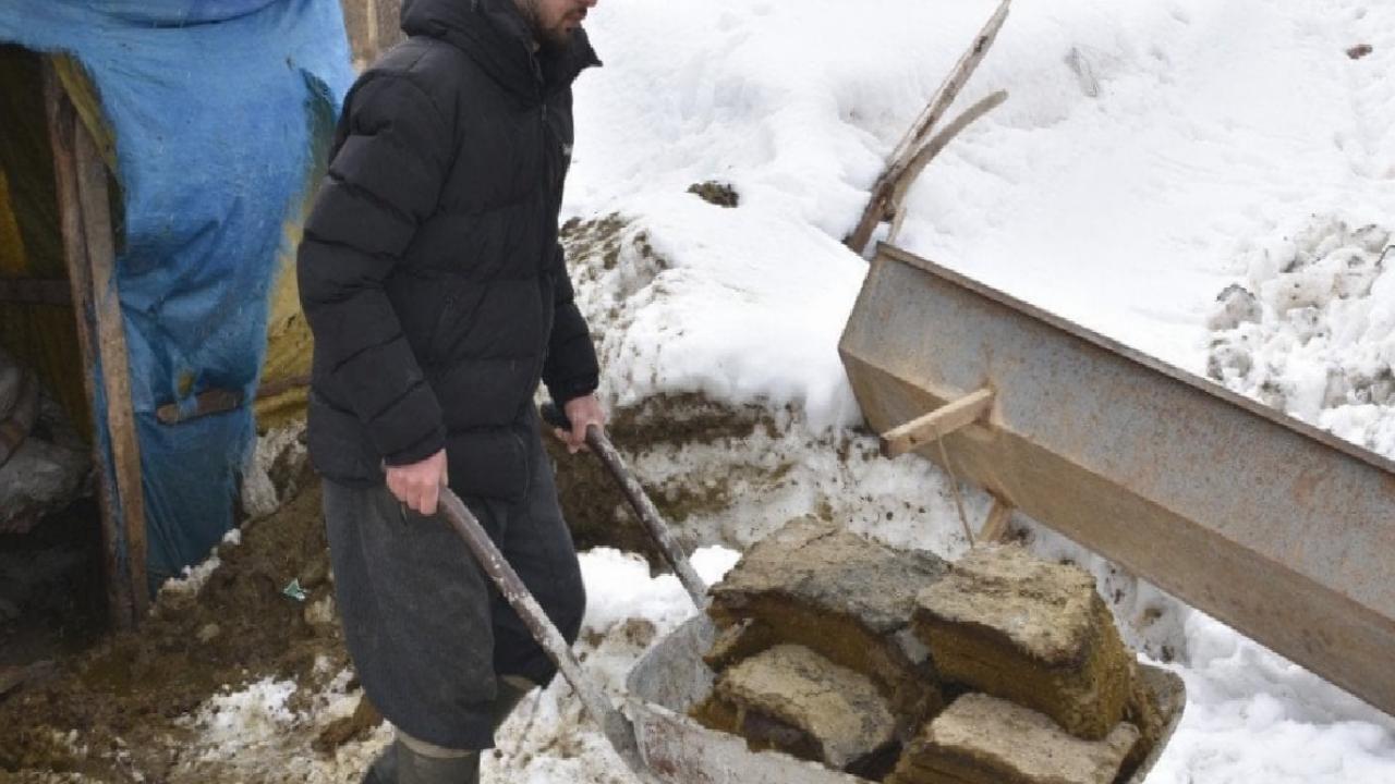 Bitlis'te kış boyunca ağıllarda biriken hayvan dışkıları, köylüler tarafından kalıplar halinde kesilerek dışarıda kurumaya bırakılıyor.