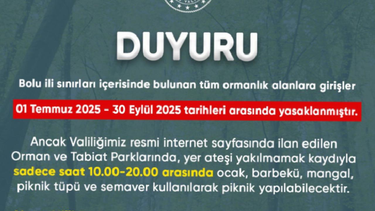 Valilik, yasal veya zorunlu izinler dışında Bolu’daki tüm ormanlık alanlara girişleri yasakladı. Sadece belirlenen alanlarda ve saatlerde (10.00-20.00) piknik yapılabilecek.