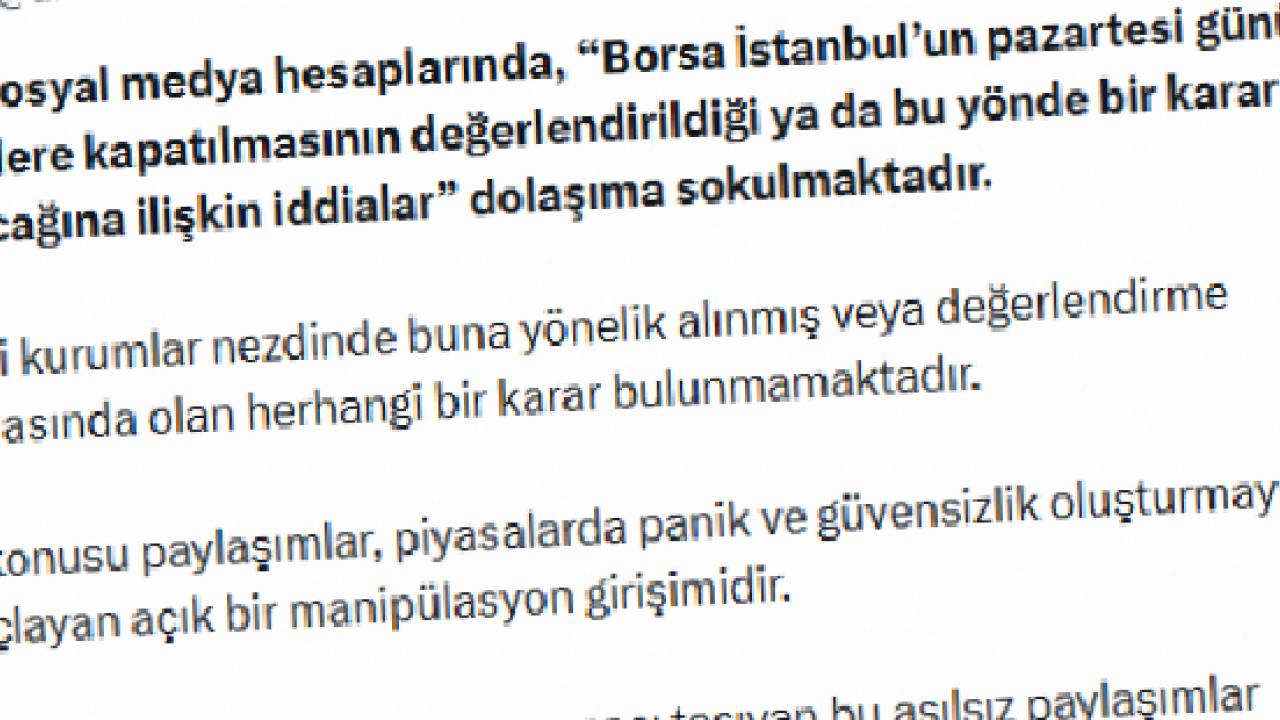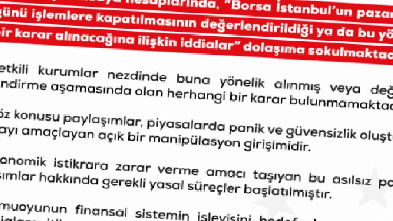 Borsa İstanbul'un pazartesi günü işlemlere kapatılmasının değerlendirildiğine yönelik iddialar kamuoyunda geniş yankı uyandırdı. Sosyal medyada hızla yayılan ve bazı basın yayın organlarında da yer bulan paylaşımlar, yatırımcılar arasında tedirginliğe neden oldu.