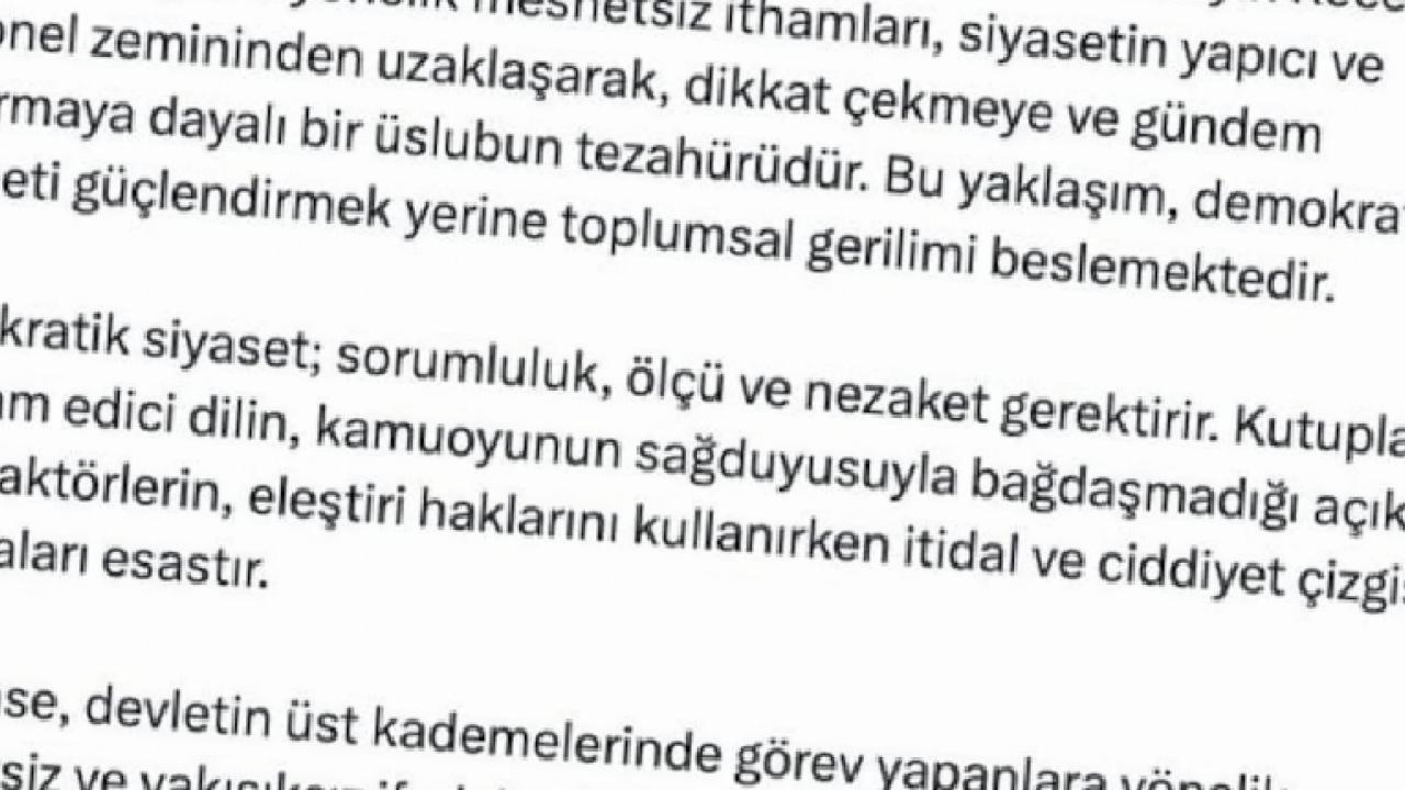 “Demokratik siyaset; sorumluluk, ölçü ve nezaket gerektirir. Kutuplaştırıcı ve itham edici dil, kamuoyunun sağduyusuyla bağdaşmamaktadır,” diyen Duran, siyasi aktörlerin eleştiri haklarını kullanırken itidal ve ciddiyet çizgisini korumalarının önemine dikkat çekti.