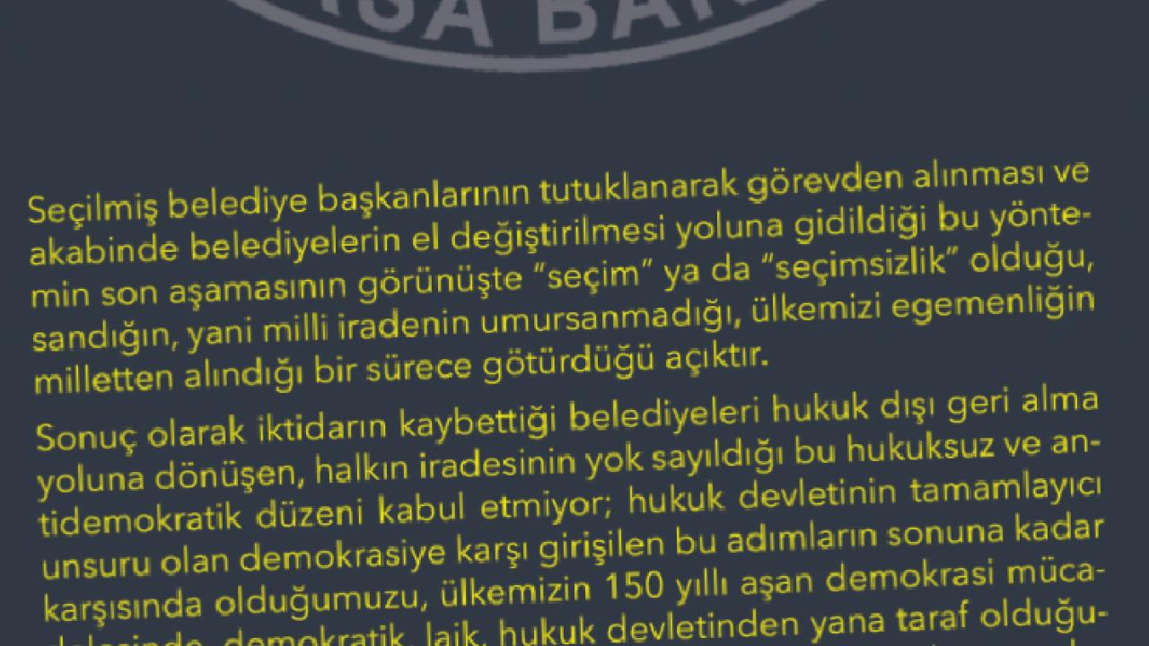 Bursa Barosu, bu uygulamaların hukuk devleti ilkesine zarar verdiğini ve demokratik düzeni tehdit ettiğini belirterek, halkın iradesinin yok sayıldığı bir sürecin kabul edilemeyeceğini vurguladı.