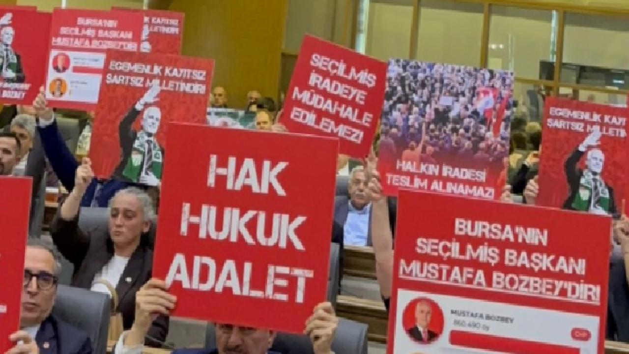 Grup sözcüsü Akbulut’un konuşması sonrasında CHP'li üyeler tarafından toplu olarak yapılan seçimi protesto ederek “Bursa’nın Başkanı Mustafa Bozbey’dir” sloganlarını attılar.