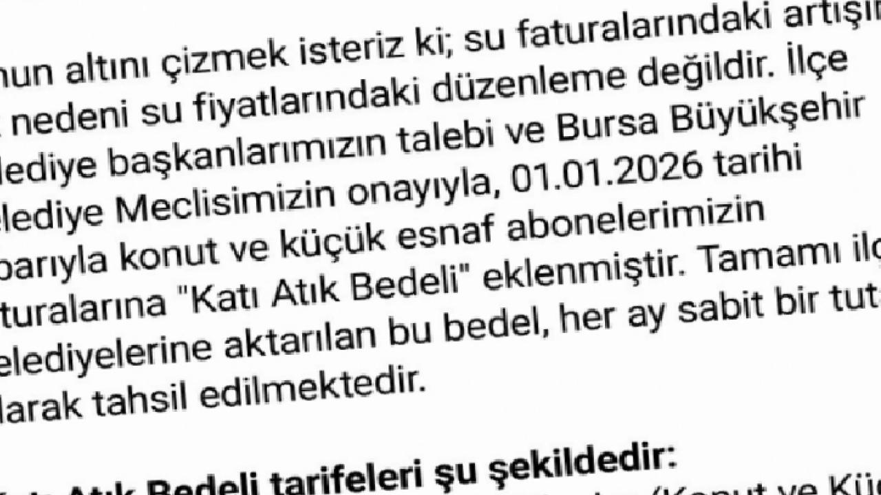 Su faturalarının artışında tek nedenin su fiyatı olmadığına dikkati çekilen açıklamada, 1 Ocak 2026 tarihi itibariyle konut ve küçük esnaf abonelerinin faturalarına ilçe belediyelerinin talebi ve Büyükşehir Belediye Meclisi onayıyla “katı atık bedeli” eklendiği kaydedildi. BUSKİ, faturalardaki görünür artışın temel nedeninin bu sabit katı atık bedeli olduğu belirtildi.