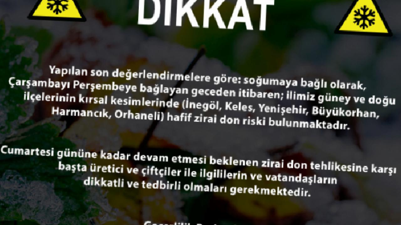 Valilik duyurusuna göre, 8 Nisan Çarşamba gecesi başlayarak 9 Nisan Perşembe’ye bağlayan geceden itibaren İnegöl, Keles, Yenişehir, Büyükorhan, Harmancık ve Orhaneli kırsal kesimlerinde zirai don tehlikesi yaşanabilir. Bu riskin 11 Nisan Cumartesi gününe kadar devam etmesi bekleniyor.