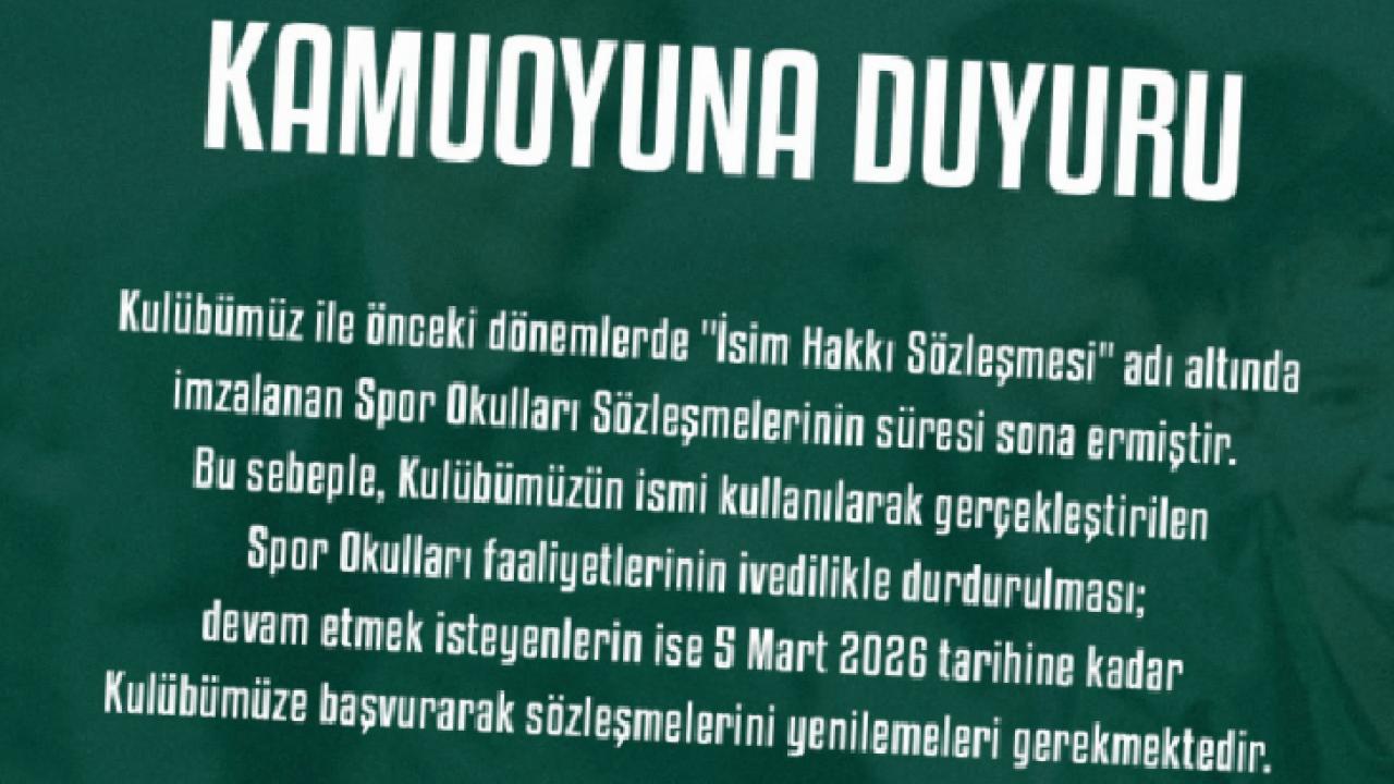 BURSA () - Bursaspor Kulübü, önceki dönemlerde “İsim Hakkı Sözleşmesi” kapsamında imzalanan Spor Okulları sözleşmelerinin süresinin sona erdiğini açıkladı. Kulüp yönetimi, sözleşme süresi biten kurumların Bursaspor adı altında yürüttüğü faaliyetlerin derhal durdurulması gerektiğini bildirdi. Açıklamada, faaliyetlerine devam etmek isteyen spor okullarının 5 Mart 2026 tarihine kadar kulübe başvurarak sözleşmelerini yenilemeleri gerektiği vurgulandı.