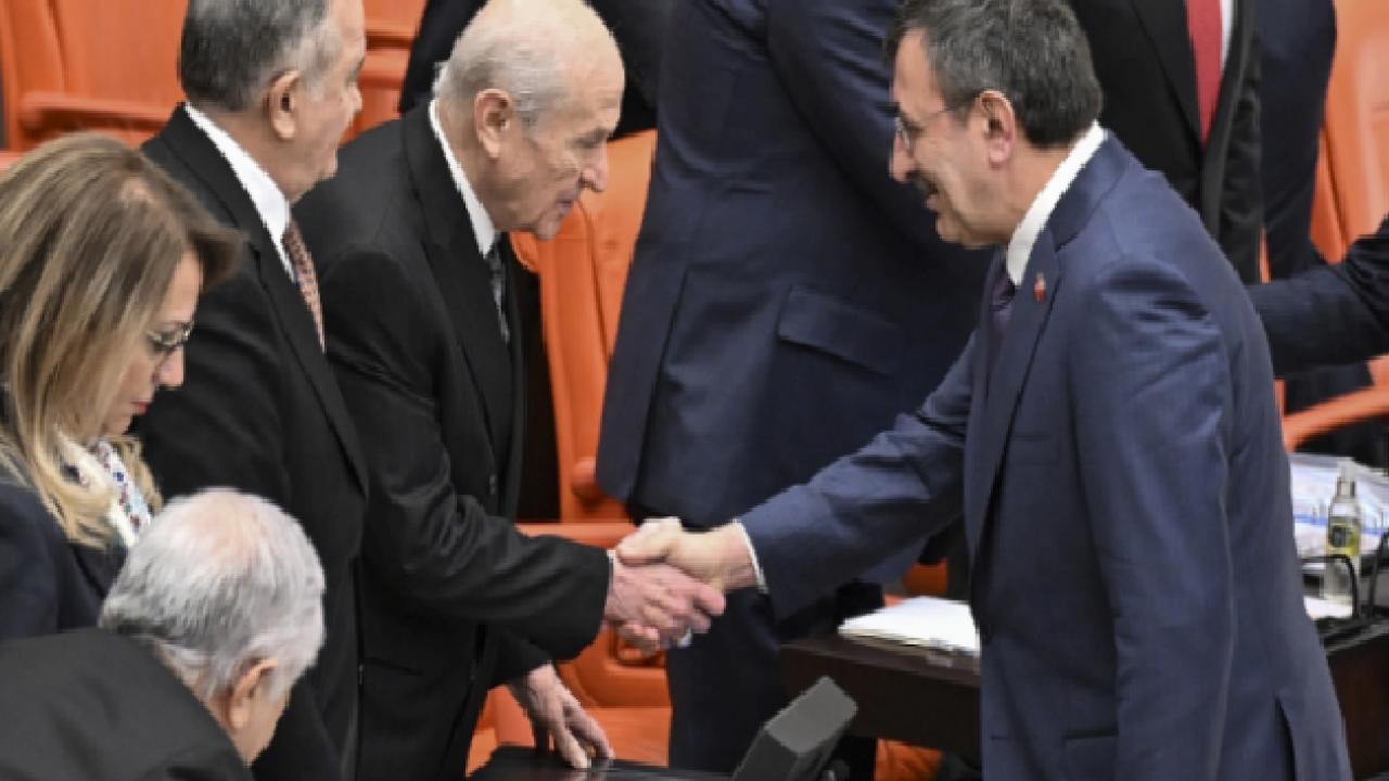 Özel, Genel Kurul Salonu'na girişinin ardından diğer genel başkanlarla ve AK Parti Grubu ile tokalaştı. Cumhurbaşkanı Yardımcısı Cevdet Yılmaz da genel başkanlarla selamlaşarak Genel Kurul'daki yerini aldı.