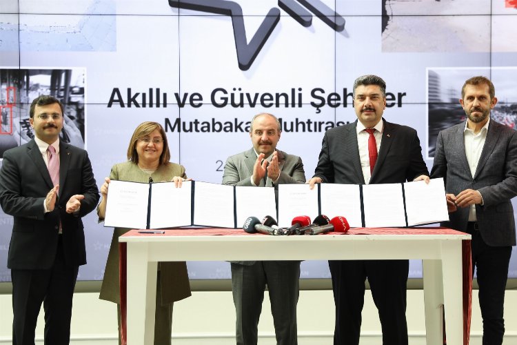 Gaziantep Büyükşehir Belediye Lideri Fatma Şahin ile HAVELSAN Genel Müdürü Dr. Mehmet Akif Acar protokolü imzalarken Sanayi ve Teknoloji Bakanı Mustafa Varank da eşlik etti.