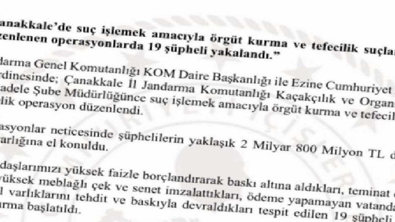 ANKARA () - İçişleri Bakanlığı, Çanakkale’de “suç işlemek amacıyla örgüt kurma” ve “tefecilik” suçlarına yönelik geniş çaplı bir operasyon düzenlendiğini duyurdu. Operasyon kapsamında 19 şüpheli gözaltına alındı.