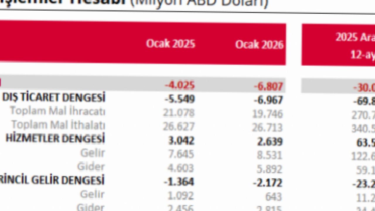 ANKARA () - Türkiye Cumhuriyet Merkez Bankası (TCMB), 2026 yılı Ocak ayına ilişkin ödemeler dengesi istatistiklerini açıkladı. Buna göre, Ocak ayında cari işlemler hesabı 6 milyar 807 milyon ABD doları açık verdi.