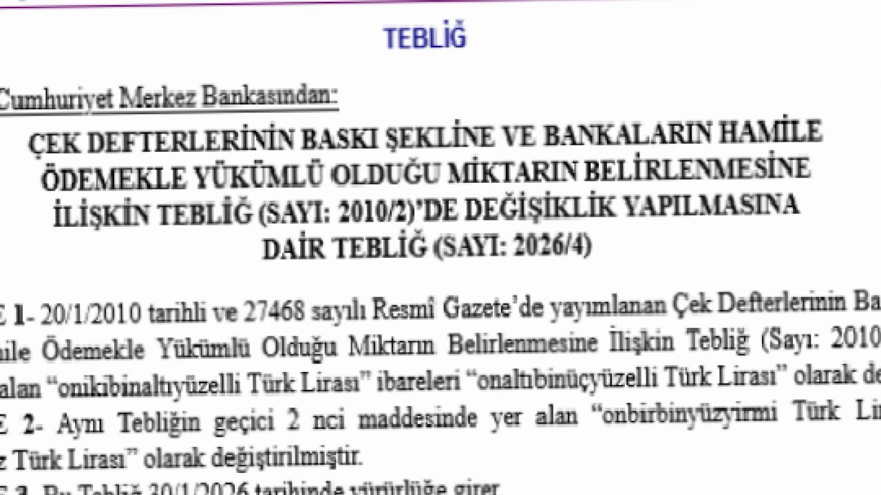 ANKARA () - Türkiye Cumhuriyet Merkez Bankası (TCMB) tarafından hazırlanan ve Resmi Gazete’nin bugünkü sayısında yayımlanan tebliğ ile çek uygulamalarında önemli bir değişikliğe gidildi.