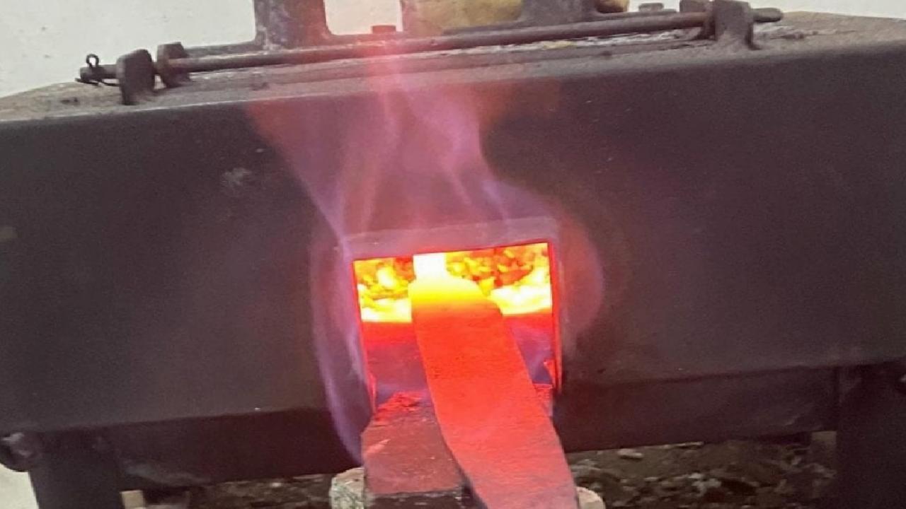 Hünal, demirci kıyafeti giymesinin ardından ateşin başına geçerek bıçak üretti.