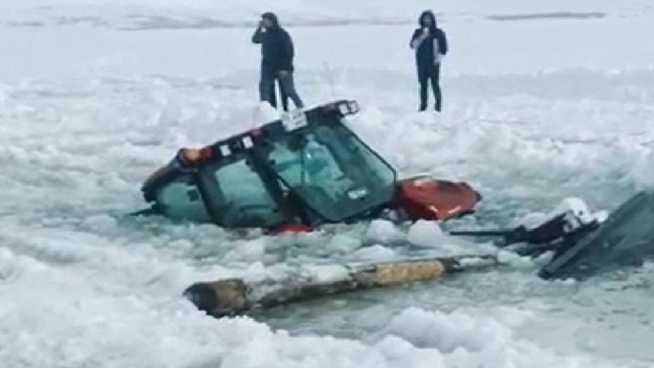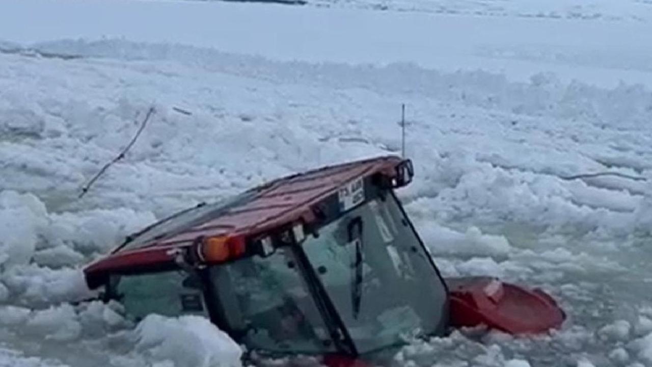 Buz tutan yüzeyi çözülen gölde, hafta sonu yapılacak olan festivalin hazırlıklarını sürdürülürken, bir traktör suya gömüldü.