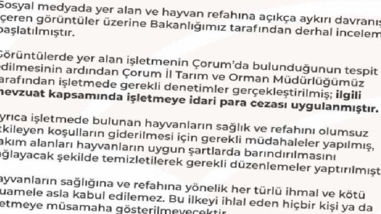 Bakanlık açıklamasında, “Bu ilkeyi ihlal eden hiçbir kişi ya da işletmeye müsamaha gösterilmeyecektir. Ülke genelinde hayvan refahının korunması amacıyla denetimlerimizi kararlılıkla sürdüreceğiz.” ifadelerine yer verildi.