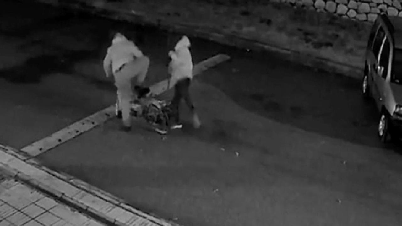 Görüntülerde, iki şahsın motosikletle iş yerinin önüne geldiği görülüyor.